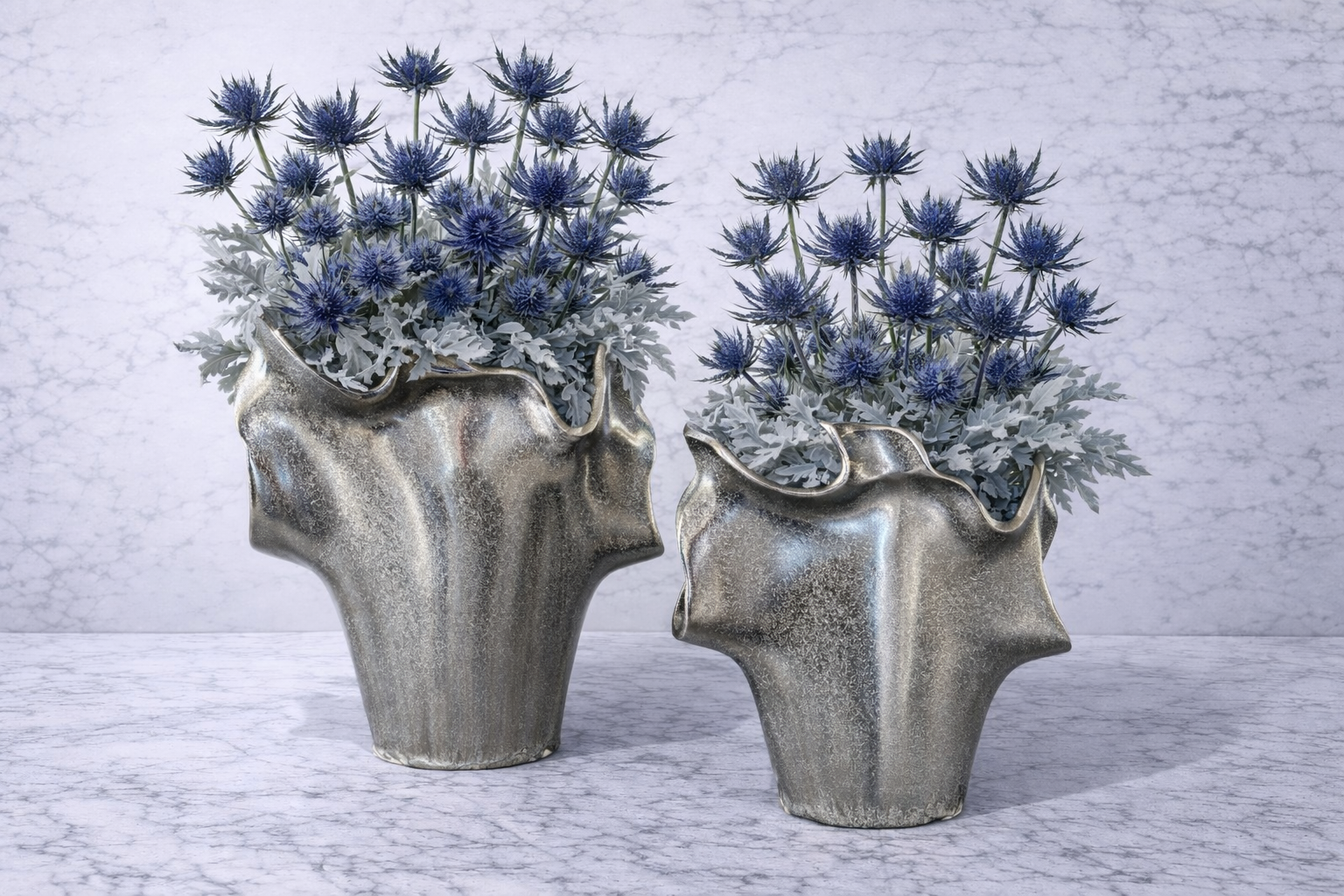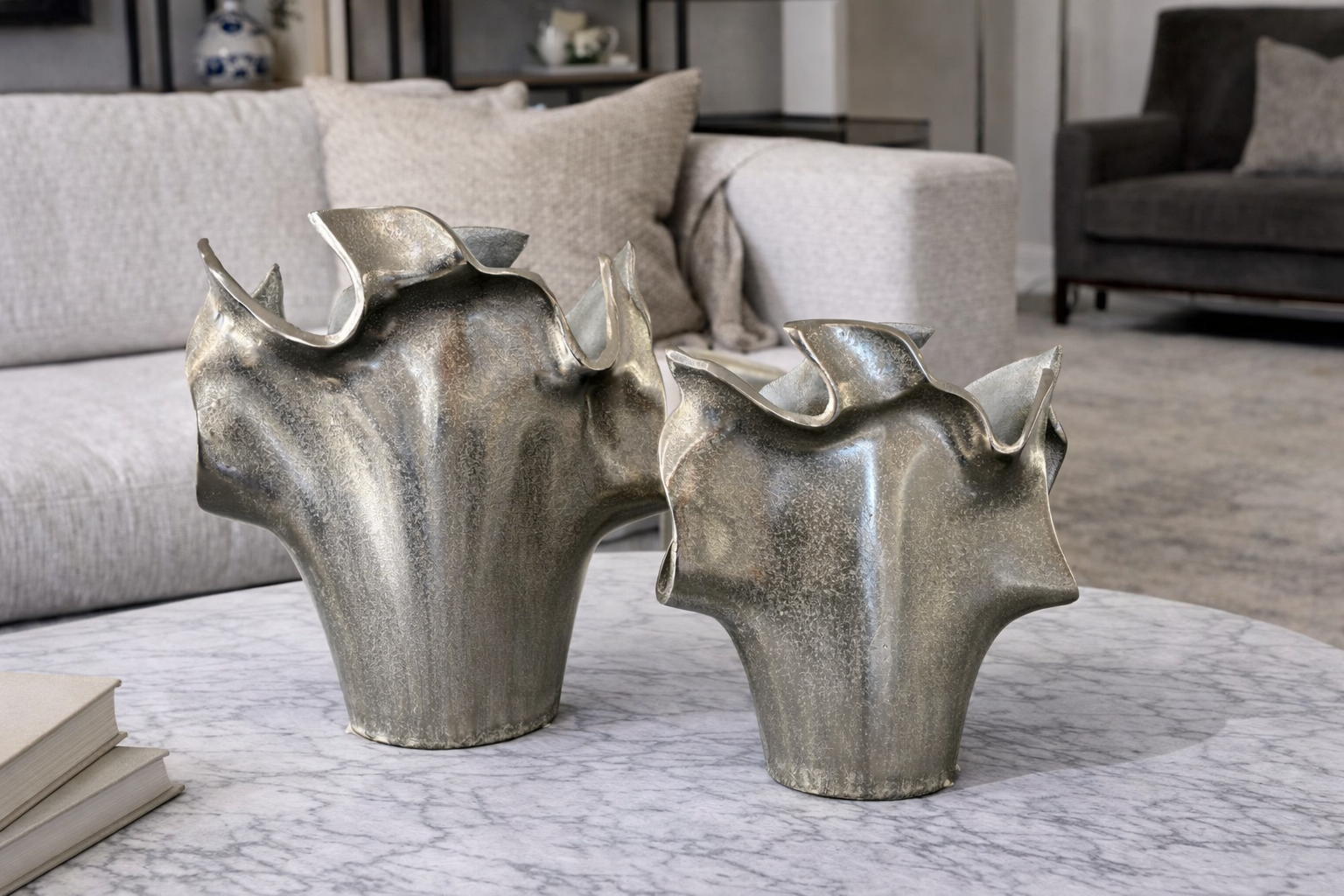 The Alex Metal Vase is a bold, sculptural statement designed to elevate modern interiors. Crafted from metal with an organically shaped silhouette, this piece features dramatic flowing edges and a rich metallic finish blending silver, bronze, and charcoal tones.