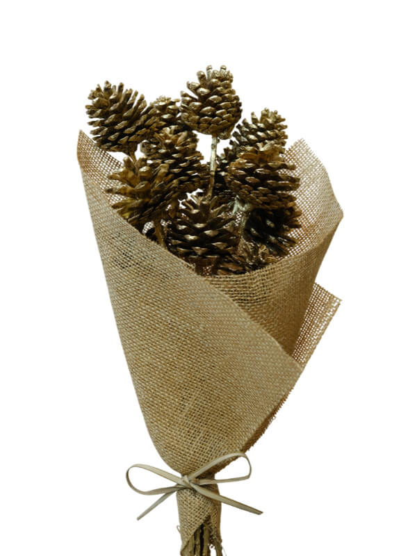 Pine Cone features woody, seed-bearing cone in a gold tone, designed to replicate the look and feel of pine. These real-touch faux pine cone are sold by the bouquet, wrapped in clear cellophane and available by the box for an additional 5% off. Trusted by florists, wedding designers, and event professionals for long-lasting arrangements.