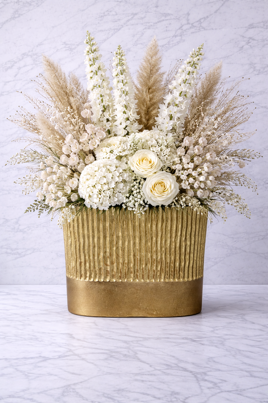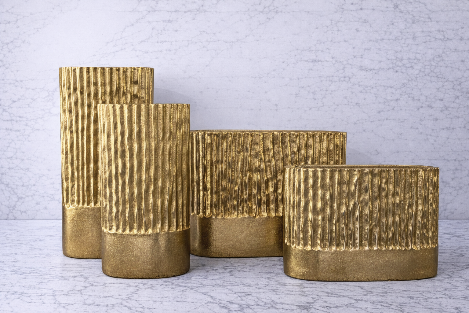 The Tobias Gold Vase Collection is a striking architectural series defined by its bold ribbed texture and clean, cylindrical silhouette. Crafted from metal and finished in a rich antique gold tone, each vase blends sculptural form with modern refinement.