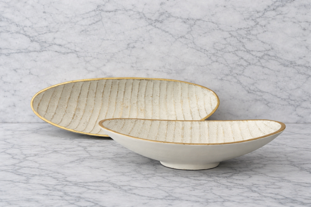 Designed in a calming white finish accented with gold detailing, these trays bring sophistication to coffee tables, consoles, dining tables, and entryway styling. Their shallow bowl form allows them to function beautifully as decorative trays, tabletop bowls, or sculptural centerpieces.